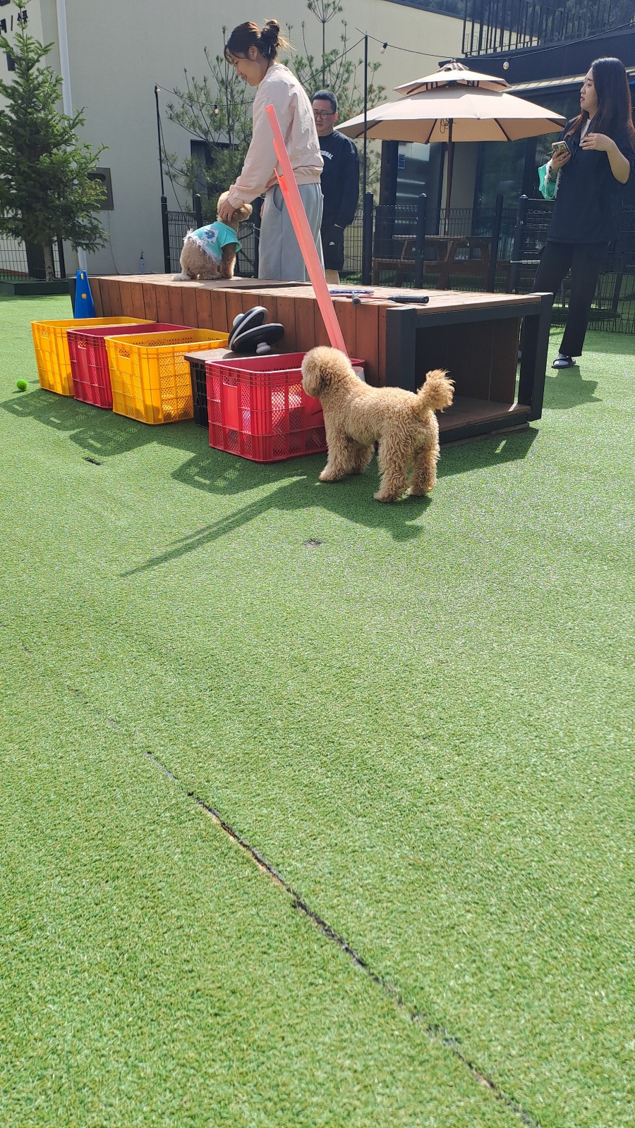 다음날 아침부터 친구들이 밖에서 노는 소리에 일찍 부터 일어나 공용운동장에서 미친 듯이 뛰어놀기 시작하였습니다. 저희 강아지는 인조잔디를 너무 좋아해서 항상 펜션을 고를 때 인조잔디가 있는 곳으로 선택을 하는 편입니다. 이번에 방문한 오블리 펜션도 개인 마당부터 넓은 공용운동장까지 모두 인조잔디로 되어 있어 가장 마음에 드는 부분이었습니다. 넓은 공용운동장에 보호자분들이 간단하게 커피를 마시거나 쉴 수 있는 테이블이나 그네 같은 휴식공간도 많았고 강아지들이 가지고 놀 수 있는 장난감 공이나 인형도 굉장히 많았습니다. 또 중간중간에 배변봉투와 쓰레기통도 있어서 바로바로 편하게 치울 수 있게 되어 있었습니다.